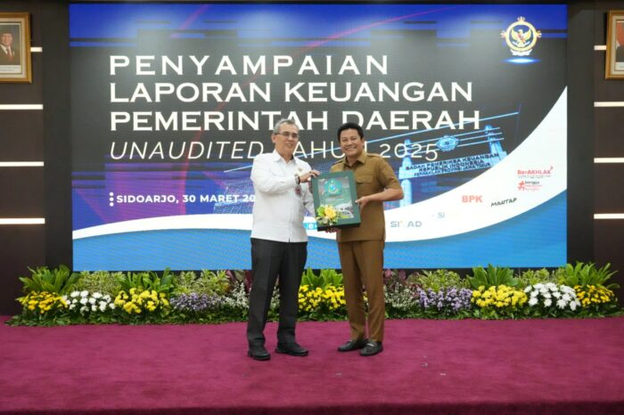 Penyerahan dokumen tersebut dilakukan secara serentak oleh seluruh pemerintah daerah se-Jawa Timur di kantor BPK RI Perwakilan Jawa Timur Hal ini yang berlokasi di Jalan Raya Ir. H. Juanda, Kecamatan Gedangan pada Senin (30/3/2026).