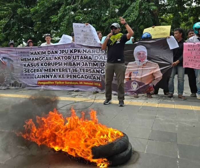 Sekitar 50 peserta aksi menggelar aksi orasi terbuka pada Senin (26/1/2026) di Surabaya, mempertanyakan diamnya aparat penegak hukum sekaligus membongkar ketimpangan anggaran hibah APBD Jawa Timur yang dinilai rawan disalahgunakan.