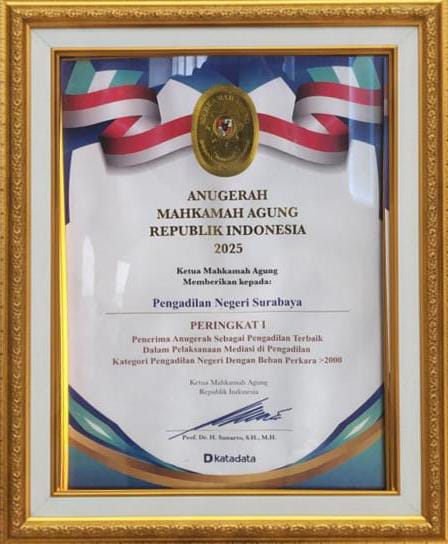 Penghargaan tersebut diberikan sebagai bentuk apresiasi Mahkamah Agung RI atas komitmen dan kinerja Pengadilan Negeri Surabaya dalam meningkatkan kualitas pelayanan peradilan, khususnya dalam penyelesaian perkara melalui mekanisme mediasi dan gugatan sederhana yang efektif, efisien, serta berorientasi pada keadilan bagi masyarakat.