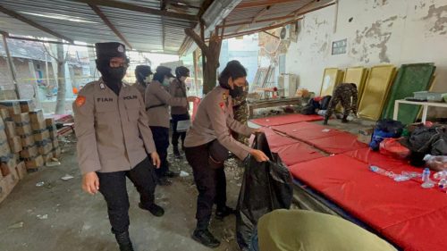 Sejumlah sampah seperti plastik bungkus makanan dan minuman dibersihkan bersama petugas Dinas Lingkungan Hidup dan Kebersihan (DLHK) Kabupaten Sidoarjo, relawan, serta Polwan. Kegiatan ini dilakukan untuk menciptakan lingkungan yang bersih dan nyaman bagi masyarakat di sekitar posko.